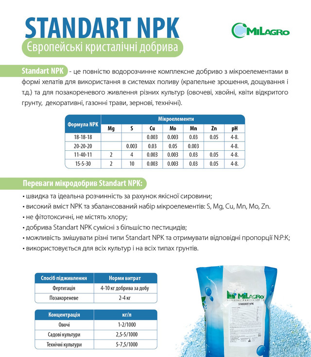 Standart NPK - це повністю водорозчинне комплексне добриво з мікроелементами у формі хелатів для використання в системах поливу (крапельне зрошення, дощування тощо) та для позакореневого підживлення різних культур (зернові, овочеві, технічні, хвойні, декоративні, квіти відкритого ґрунту, газонні трави).